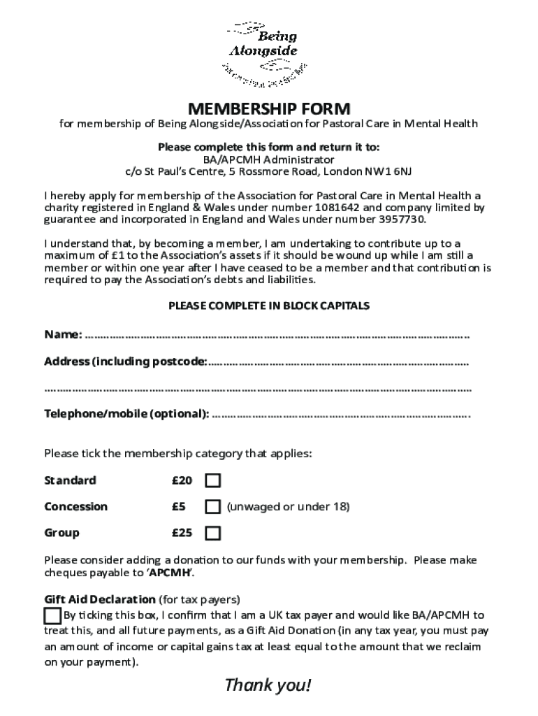 MEMBERSHIPFORMformembershipofBeingAlongside/Associate onforPastoralCareinMentalHealth Pleasecompletethisformandreturnitto: BA/APCMHAdministrator c/oStPaulsCentre,5RossmoreRoad,LondonNW16NJ IherebyapplyformembershipoftheAssocia