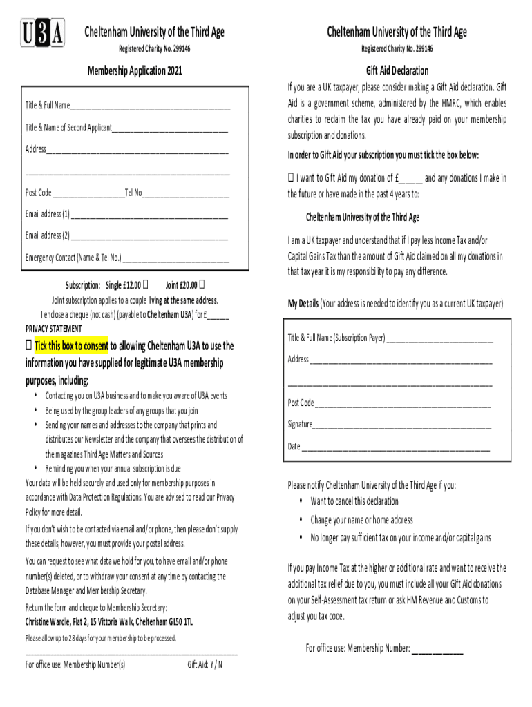 Cheltenham University of the Third Cheltenham University of the Third Preregistered Charity No. 299146Registered Charity No. 299146Membership Application 2021Gift Aid DeclarationTitle & Full Name