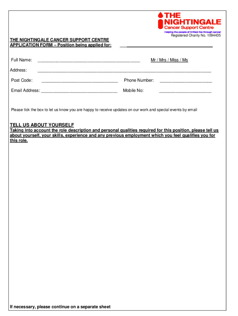Registered Charity No. 1094435THE NIGHTINGALE CANCER SUPPORT Center APPLICATION FORM Position being applied for: Full Name: Address: Post Code: Email Address: Mr / Mrs / Miss / Phone Number: Mobile