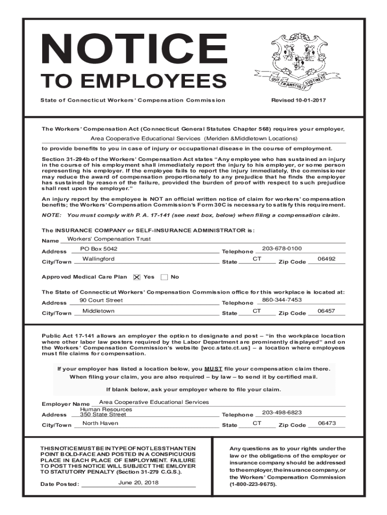 NOTICE TO EMPLOYEESState of Connecticut Workers Compensation CommissionRevised 10012017The Workers Compensation Act (Connecticut General Statutes Chapter 568) requires your employer, Area Cooperative
