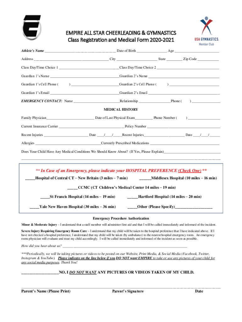 EMPIRE ALL STAR CHEERLEADING & GYMNASTICS Class Registration and Medical Form 20202021 Athletes Name Date of Birth Age Address City State Zip Code Class Day/Time Choice 1 Class Day/Time Choice 2 Guardian