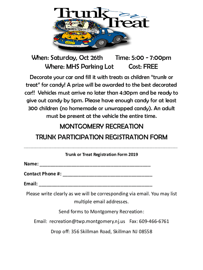 When: Saturday, Oct 26th Time: 5:00 7:00pm Where: MRS Parking Lot Cost: FREE Decorate your car and fill it with treats as children trunk or treat for candy! A prize will be awarded to the best decorated