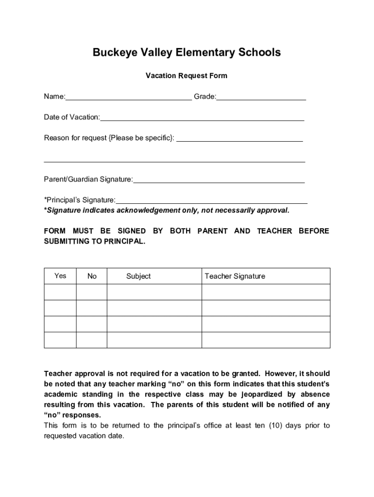 Buckeye Valley Elementary Schools Vacation Request Form Name: Grade: Date of Vacation: Reason for request Please be specific: Parent/Guardian Signature: *Principals Signature: *Signature indicates