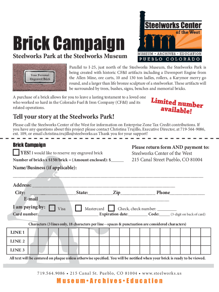 Brick CampaignSteelworks Park at the Steelworks Museum Your Personal Engraved BrickParallel to I25, just north of the Steelworks Museum, the Steelworks Park is being created with historic CFI artifacts
