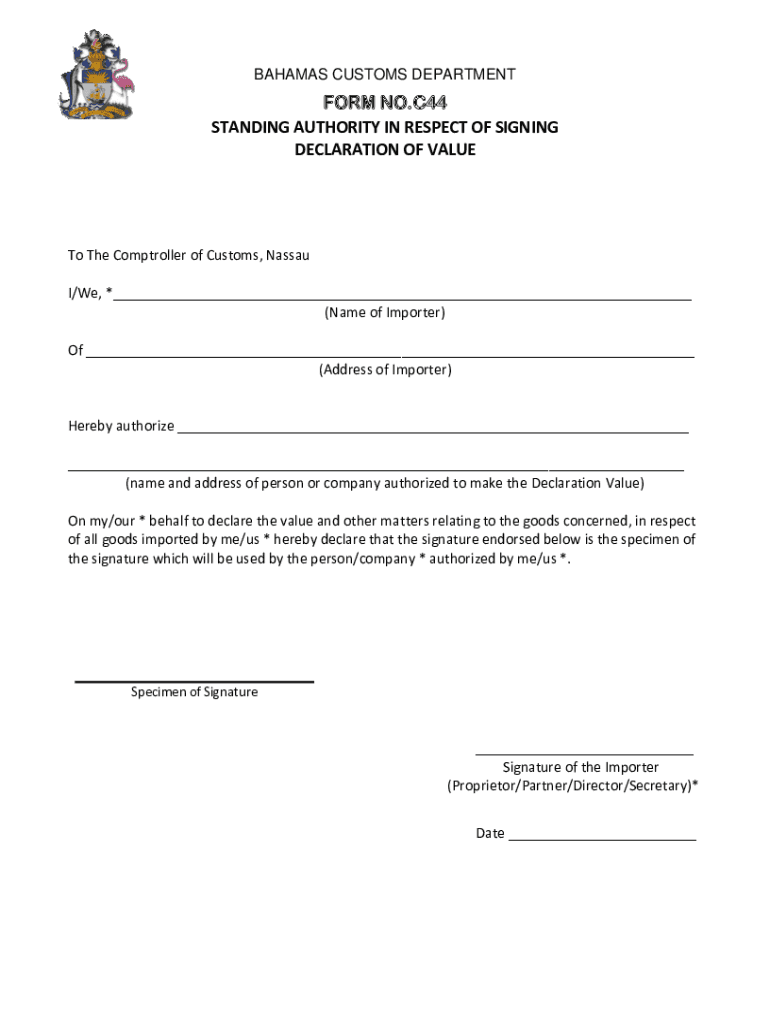 BAHAMAS CUSTOMS DEPARTMENTFORM NO. C44 STANDING AUTHORITY IN RESPECT OF SIGNING DECLARATION OF Value The Comptroller of Customs, Nassau I/We, * (Name of Importer) Of (Address of Importer)Hereby authorize