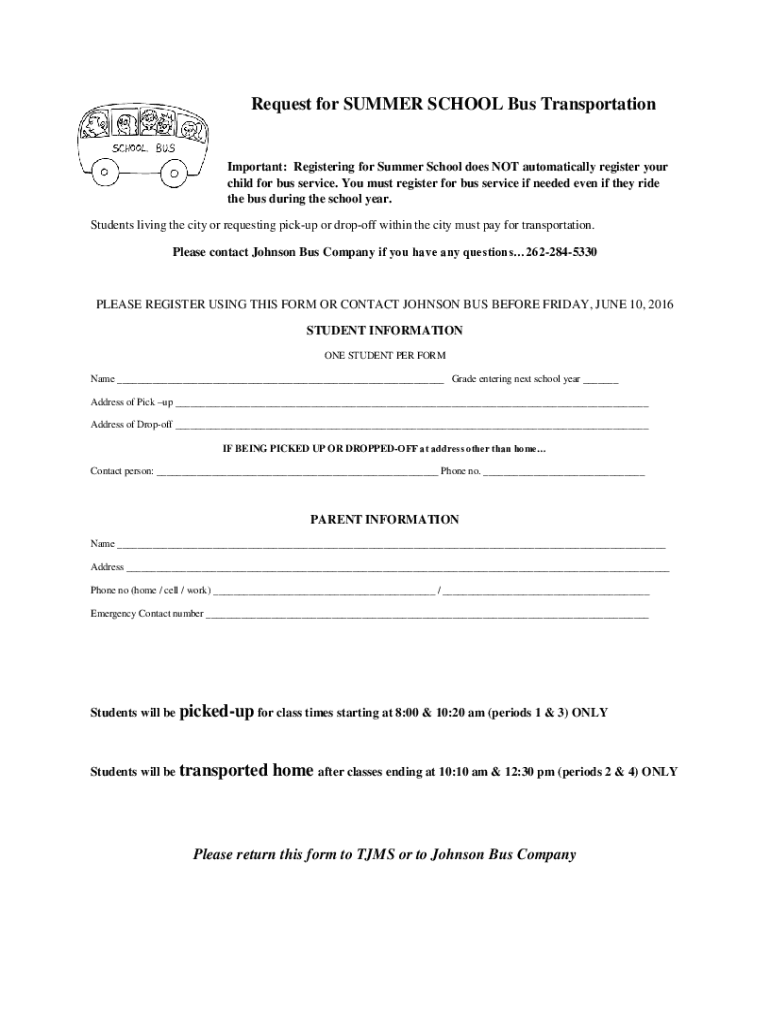Request for SUMMER SCHOOL Bus TransportationImportant: Registering for Summer School does NOT automatically register your