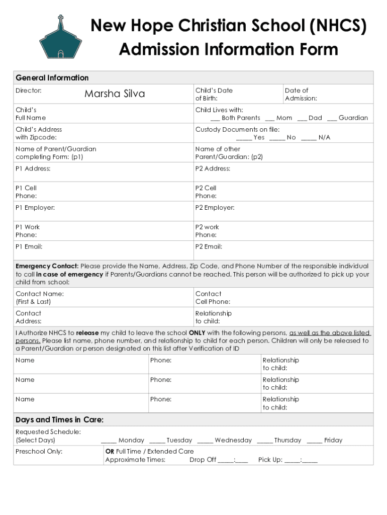 New Hope Christian School (NHS) Admission Information Form General Information Director:Child's Date of Birth:Marsha Silicate of Admission:Child's Full Lovechild Lives with: Both Parents Mom Dad GuardianChilds