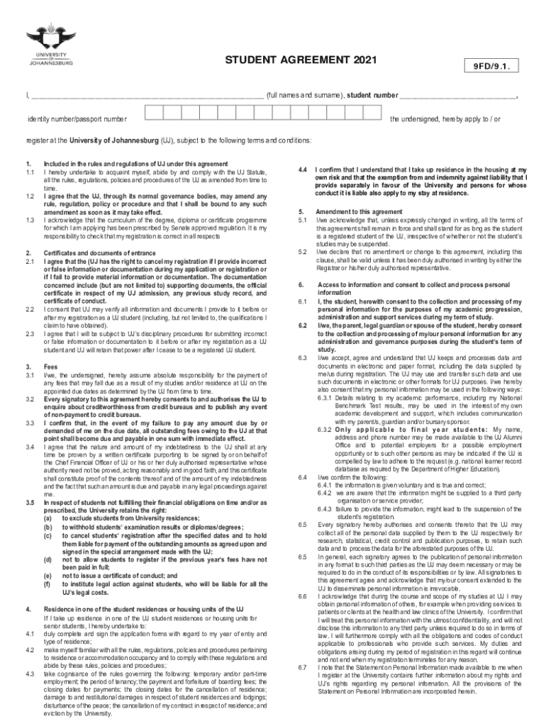 SECTION H: A 2015STUDENT AGREEMENT 20219FD/9.1. 2.1I, (full names and surname), student number, identity number/passport number the undersigned, hereby apply to / or register at the University of