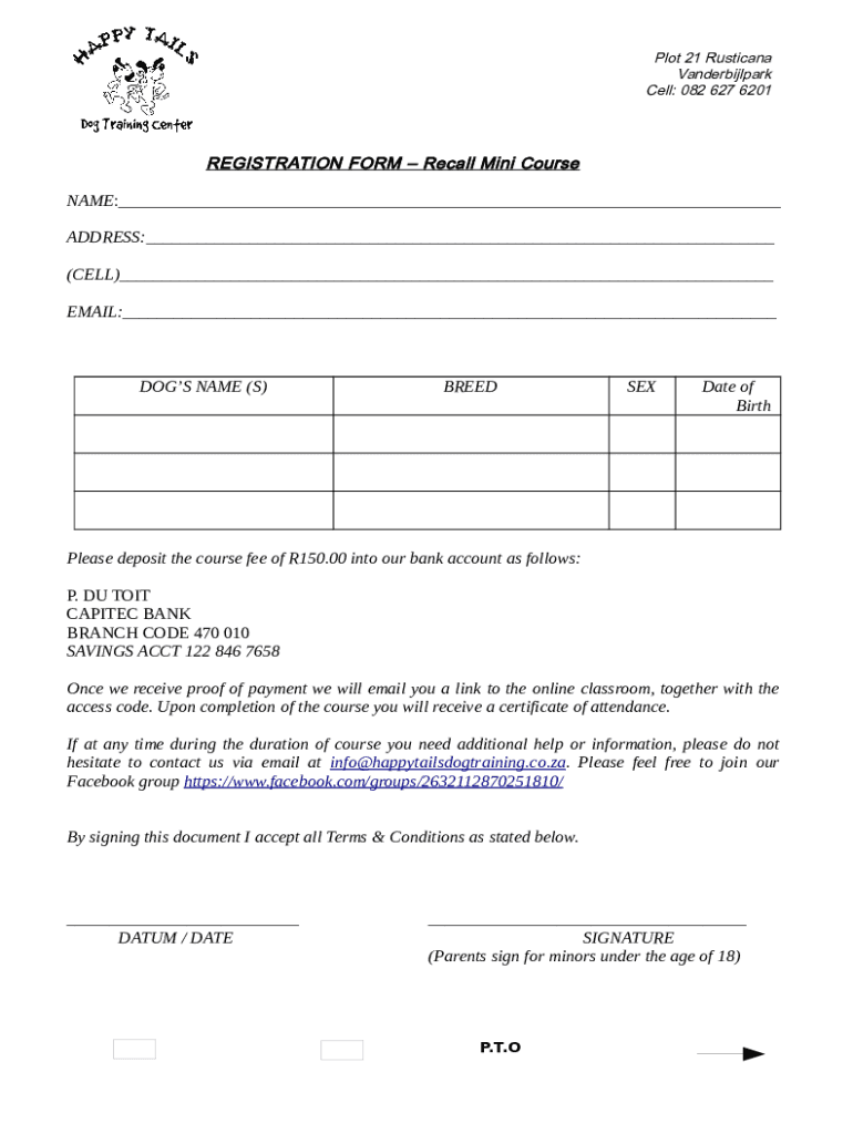 Plot 21 Rusticate Vanderbijlpark Cells: 082 627 6201REGISTRATION FORM Recall Mini Course NAME: ADDRESS: (CELL) EMAIL: DOGS NAME (S)BREEDSEXDate of Birthplace deposit the course fee of R150.00 into