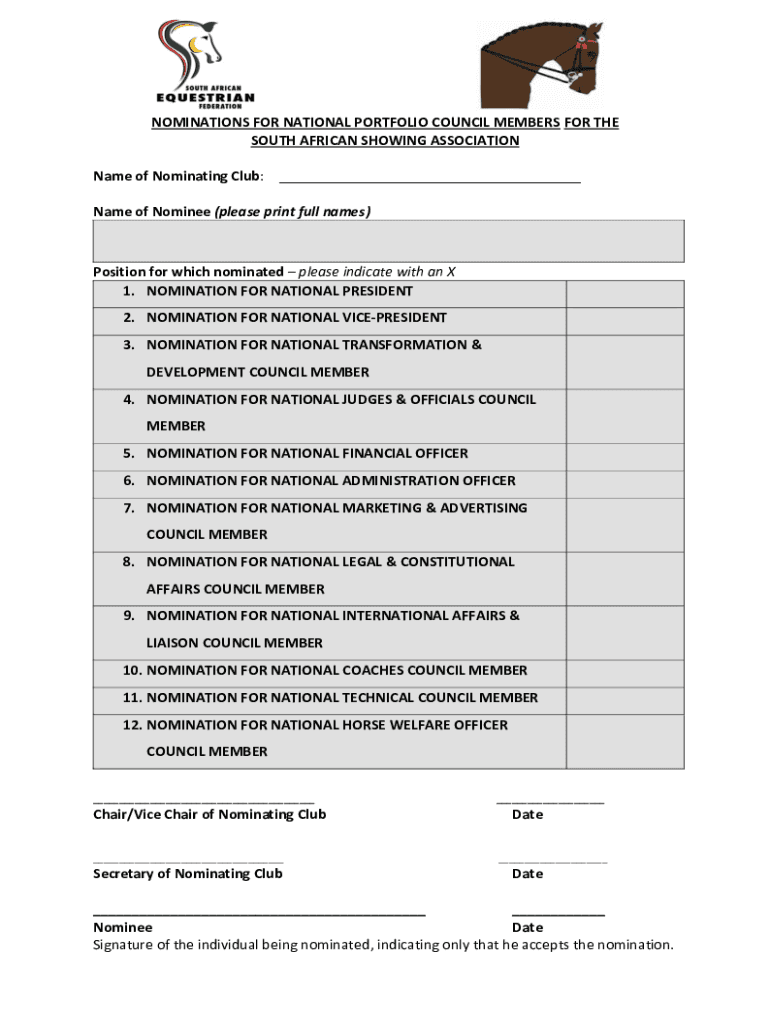 NOMINATIONS FOR NATIONAL PORTFOLIO COUNCIL MEMBERS FOR THE SOUTH AFRICAN SHOWING ASSOCIATION Name of Nominating Club: Name of Nominee (please print full names)Position for which nominated please indicate
