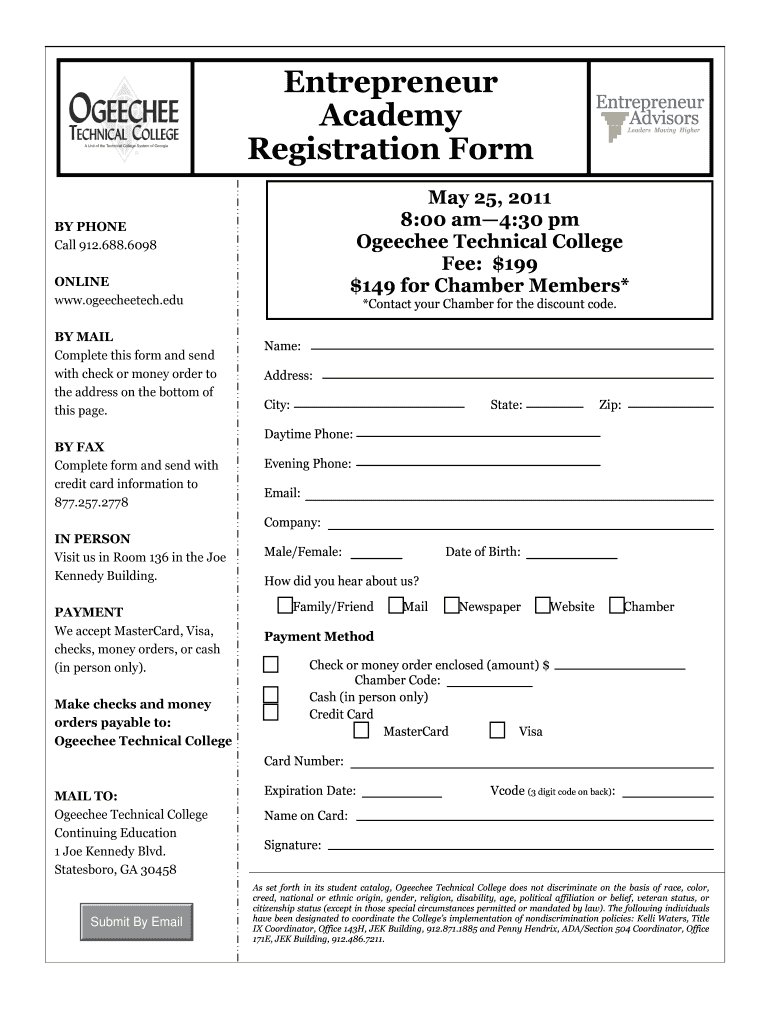 Entrepreneur Academy Registration Form May 25, 2011 8:00 am 4:30 pm Ogeechee Technical College Fee: $$199149 for Chamber Members* BY PHONE Call 912.688.6098 ONLINE www.ogeecheetech.edu BY MAIL Complete
