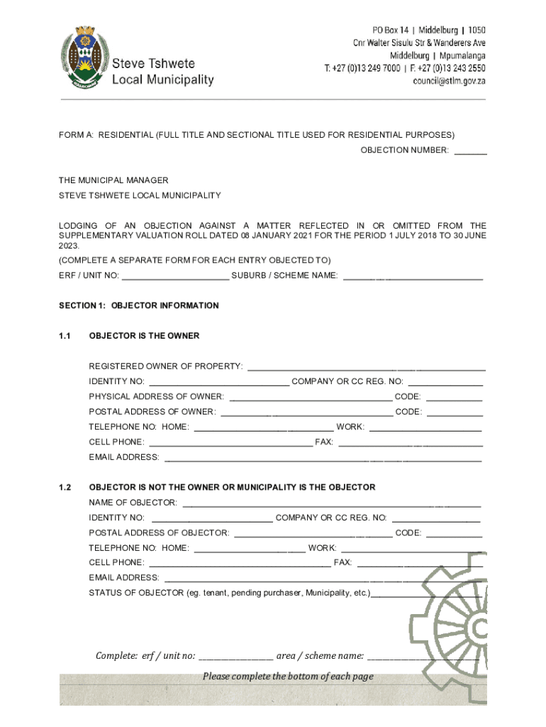 FORM A: RESIDENTIAL (FULL TITLE AND SECTIONAL TITLE USED FOR RESIDENTIAL PURPOSES) OBJECTION NUMBER: THE MUNICIPAL MANAGER STEVE THERE LOCAL MUNICIPALITY LODGING OF AN OBJECTION AGAINST A MATTER REFLECTED