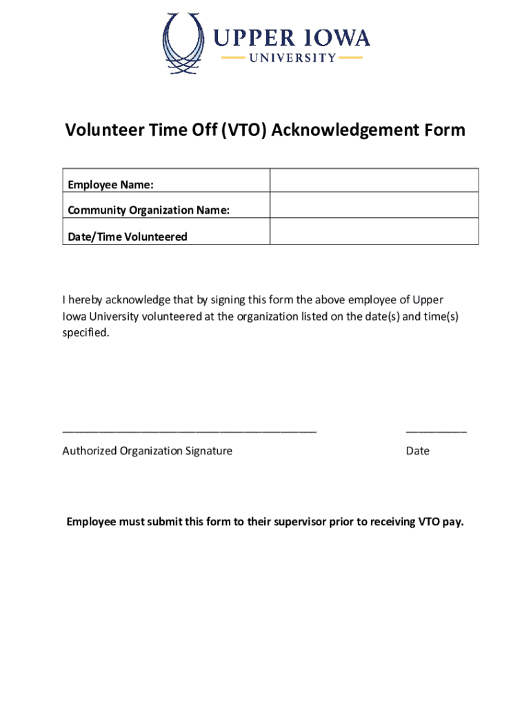 Volunteer Time Off (TO) Acknowledgement Form Employee Name: Community Organization Name: Date/Time Volunteered hereby acknowledge that by signing this form the above employee of Upper Iowa University