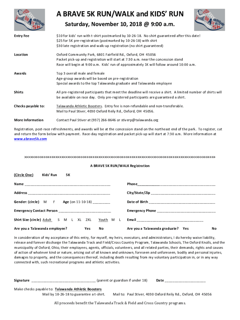 EntryFee$10forkidsrunwithtshirtpostmarkedby102618. Noshirtguaranteedafterthisdate!