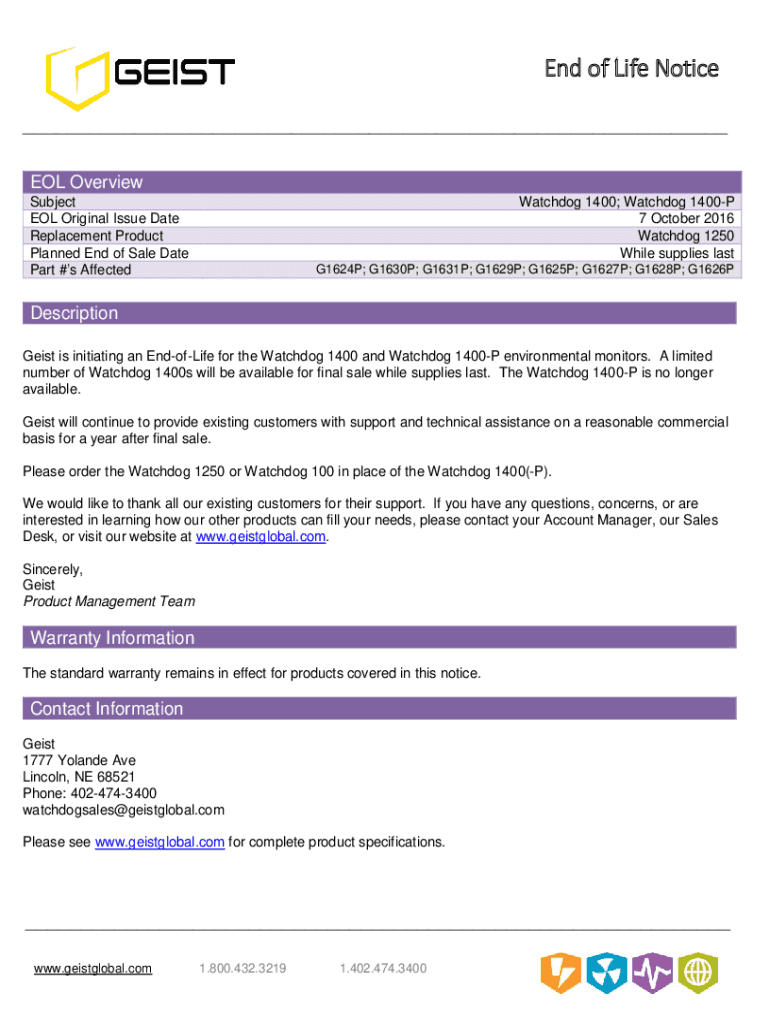 End of Life Notice EOL Overview Subject EOL Original Issue Date Replacement Product Planned End of Sale Date Part #s AffectedWatchdog 1400; Watchdog 1400P 7 October 2016 Watchdog 1250 While supplies