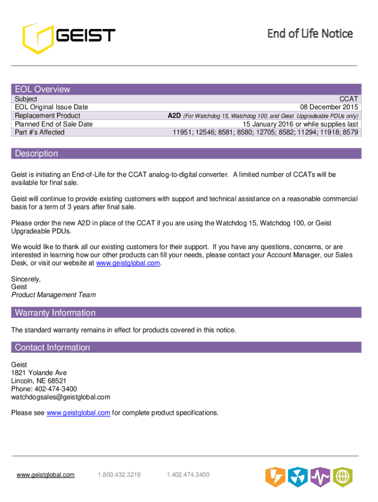 End of Life Notice EOL Overview Subject EOL Original Issue Date Replacement Product Planned End of Sale Date Part #s AffectedCCAT 08 December 2015 A2D (For Watchdog 15, Watchdog 100, and Last Upgradeable