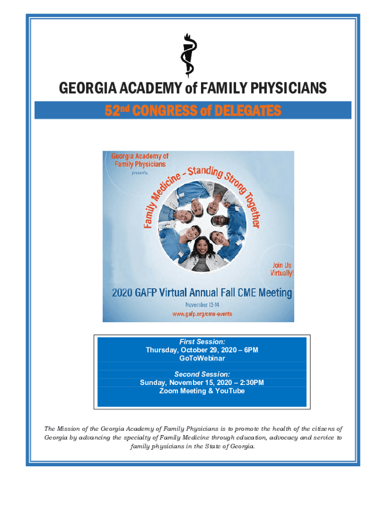 GEORGIA ACADEMY of FAMILY PHYSICIANS 52nd CONGRESS of DELEGATESFirst Session: Thursday, October 29, 2020 6PM GoToWebinar Second Session: Sunday, November 15, 2020 2:30PM Zoom Meeting & YouTube Mission
