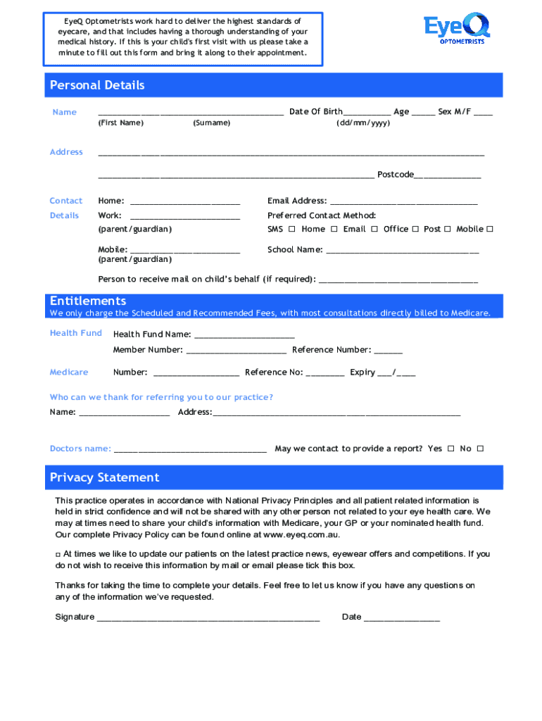 Eye Optometrists work hard to deliver the highest standards of eyewear, and that includes having a thorough understanding of your medical history. If this is your child's first visit with us please