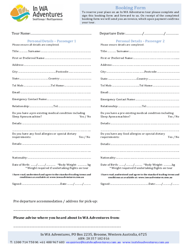 Booking Form reserve your place on an In WA Adventures tour please complete andsignthisbookingformandforwardtous. Onreceiptofthecompletedbooking form we will send you an invoice, which upon payment