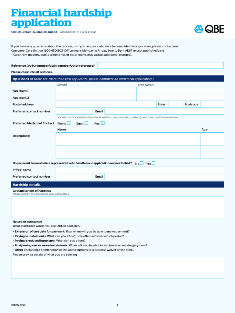 Financial hardship application QBE Insurance (Australia) Limited ABN 78 003 191 035 ADSL 239 545If you have any questions about the process, or if you require assistance to complete this application,
