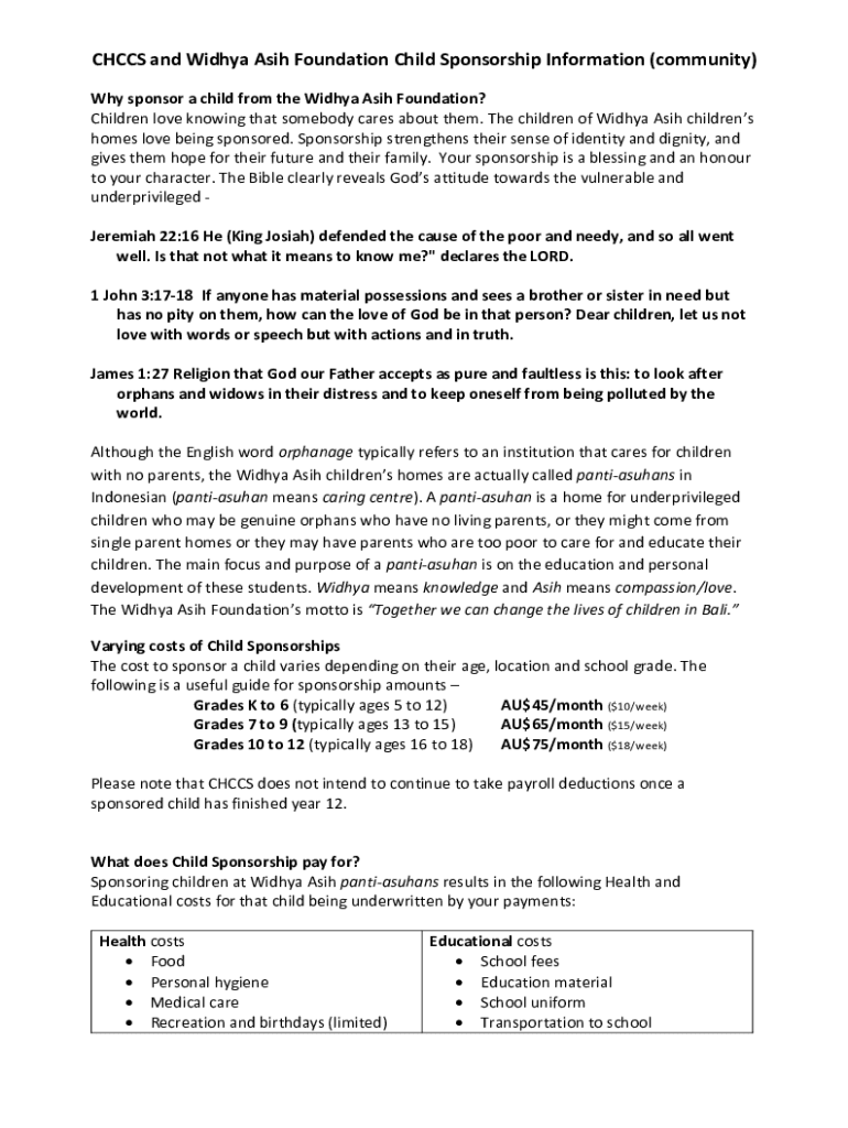 To fill out child sponsorship forms for coffsccsnsweduau, individuals or organizations must provide details about the sponsored child, the sponsorship agreement, and any financial contributions made.
