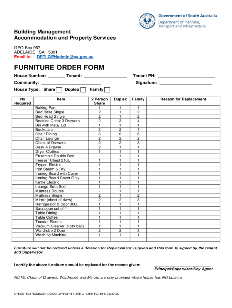 Get the free FURNITURE ORDER FORM - South Australia