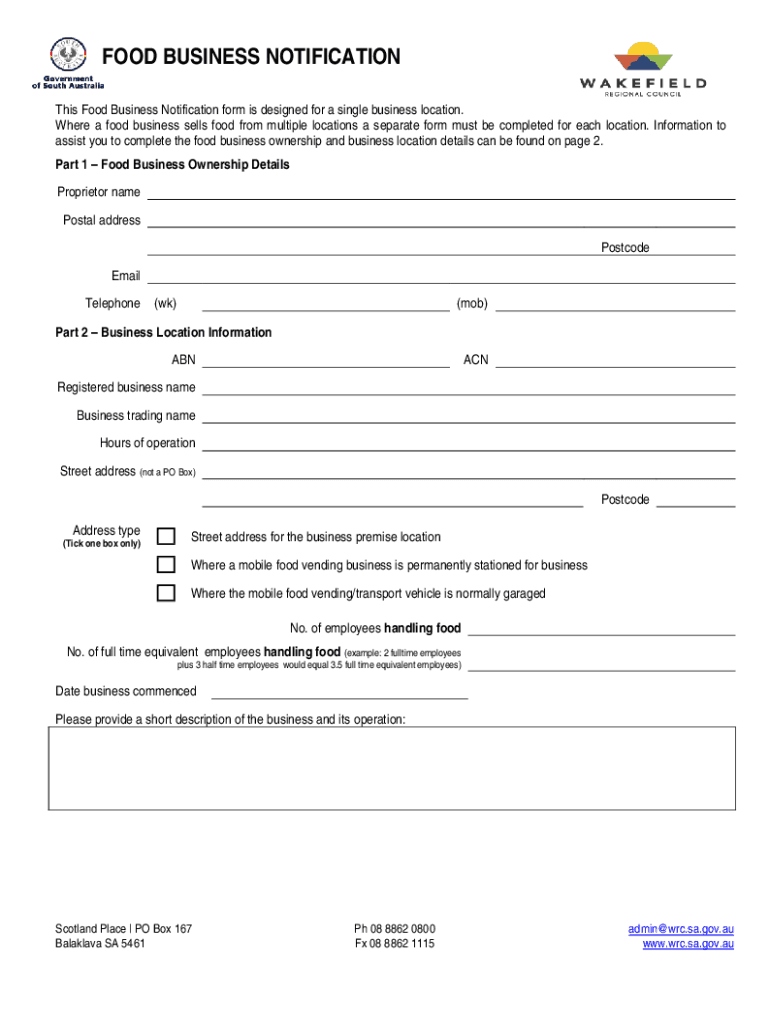 FOOD BUSINESS NOTIFICATION This Food Business Notification form is designed for a single business location. Where a food business sells food from multiple locations a separate form must be completed