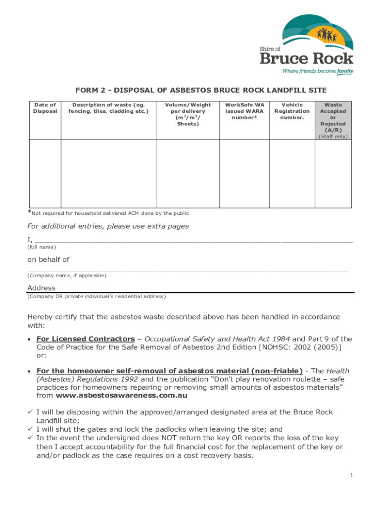 Get the free FORM 2 - DISPOSAL OF ASBESTOS BRUCE ROCK LANDFILL SITE