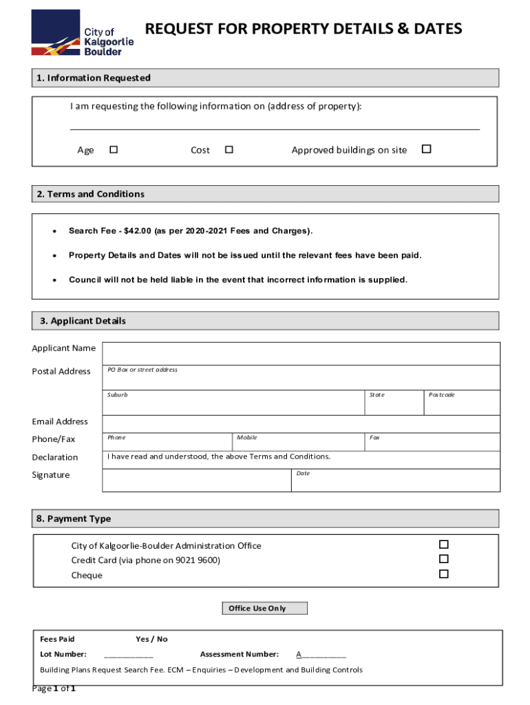 REQUEST FOR PROPERTY DETAILS & DATES 1. Information Requested I am requesting the following information on (address of property): AgeCostApproved buildings on site2. Terms and Conditions Search Fee