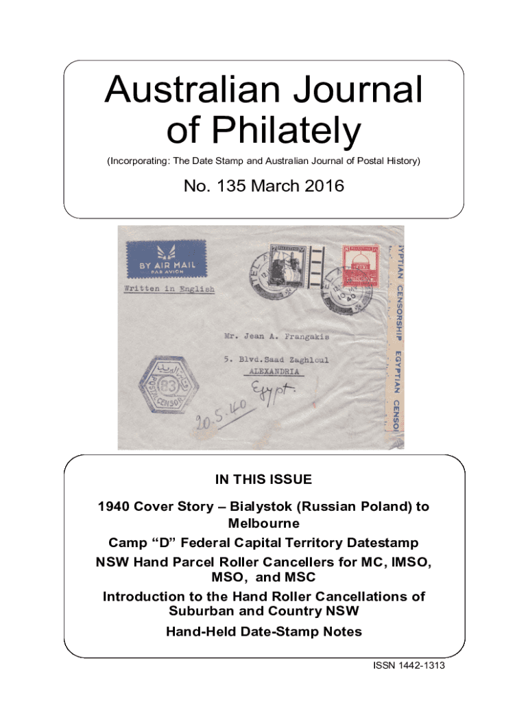 Australian Journal of Philately (Incorporating: The Date Stamp and Australian Journal of Postal History)No. 135 March 2016IN THIS ISSUE 1940 Cover Story Bialystok (Russian Poland) to Melbourne Camp