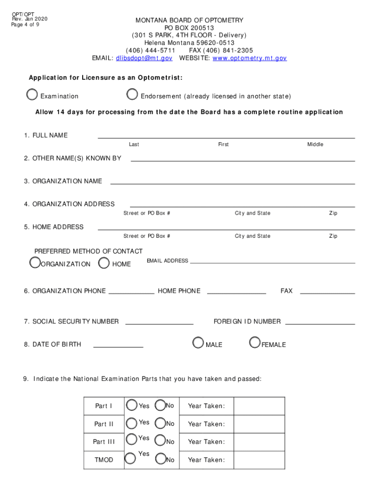 OPT/OPT Rev. Jan 2020-Page 1 of 9MONTANA BOARD OF OPTOMETRY PO BOX 200513 (301 S Parks, 4TH FLOOR Delivery) Helena Montana 596200513 (406) 4446880 FAX (406) 8412305 EMAIL: dlibsdopt CT.gov WEBSITE: