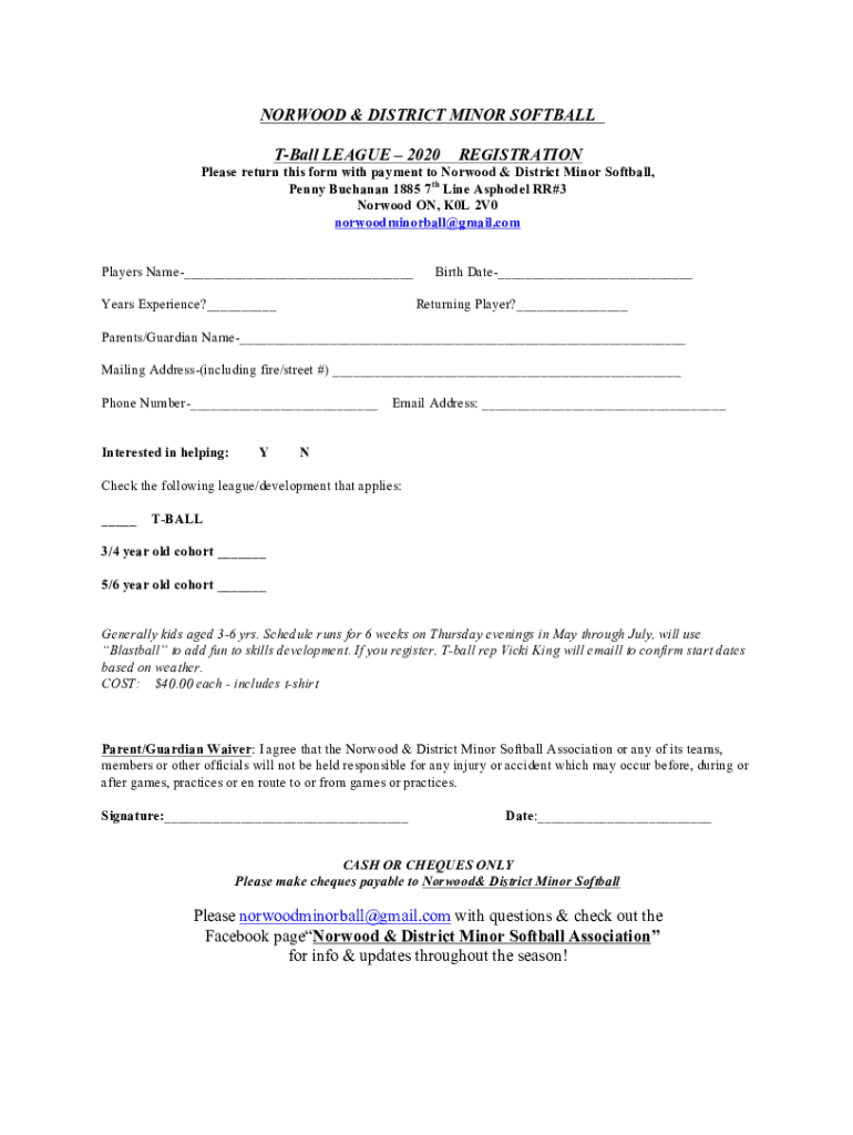 NORWOOD & DISTRICT MINOR SOFTBALL Ball LEAGUE 2020REGISTRATIONPlease return this form with payment to Norwood & District Minor Softball, Penny Buchanan 1885 7th Line Asphodel RR#3 Norwood ON, K0L