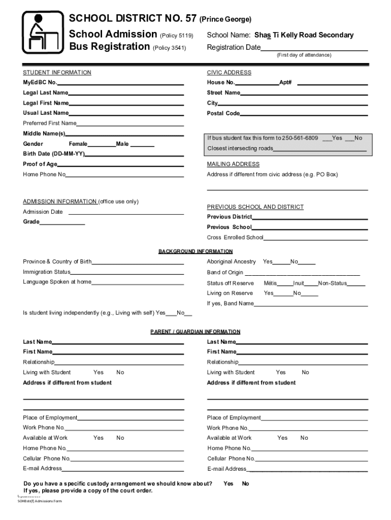 SCHOOL DISTRICT NO. 57 (Prince George) School Admission (Policy 5119) Bus Registration (Policy 3541)School Name: Has Ti Kelly Road Secondary Registration Date (First day of attendance)STUDENT INFORMATIONCIVIC