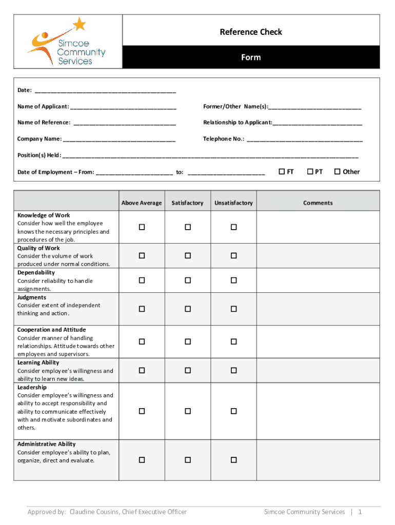 Reference Check Format: Name of Applicant: Former/Other Name(s): Name of Reference: Relationship to Applicant: Company Name: Telephone No.: Position(s) Held: Date of Employment From: to: Knowledge