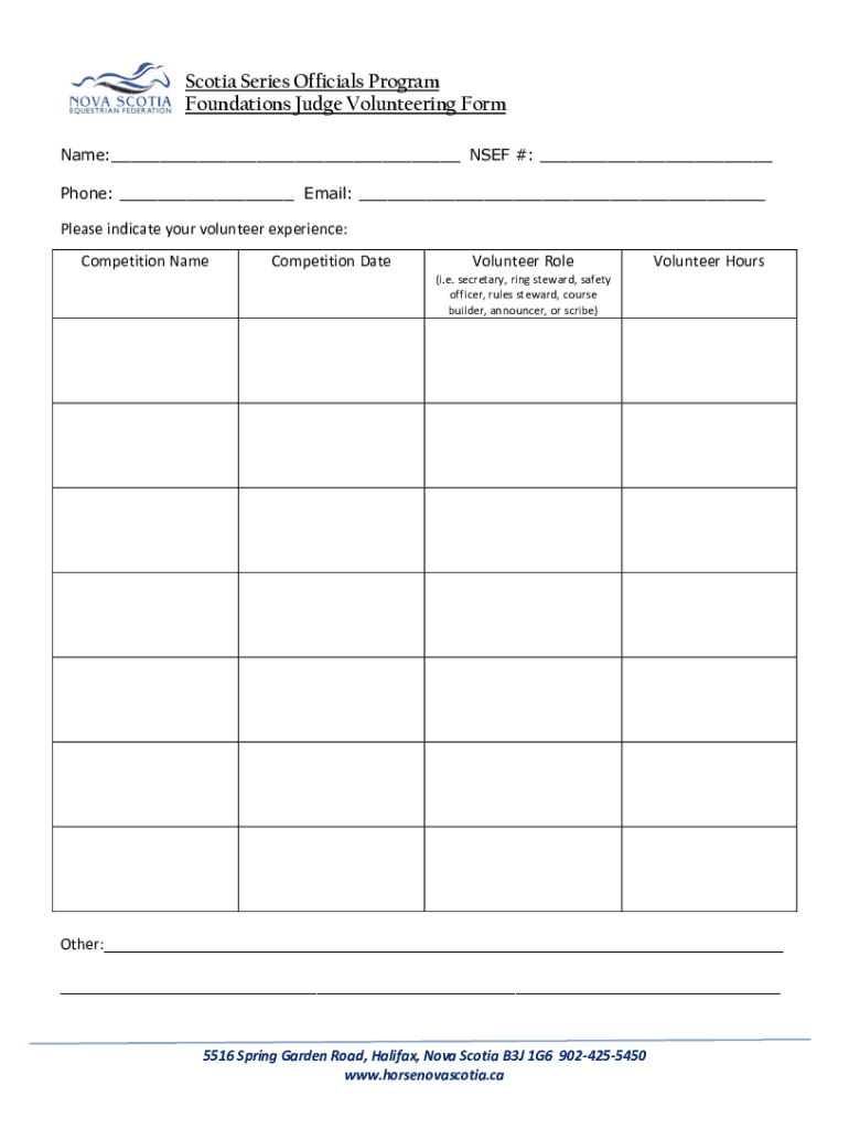 Scotia Series Officials Program Foundations Judge Volunteering Form Name: NSF #: Phone: Email: Please indicate your volunteer experience: Competition NameCompetition DateVolunteer RoleVolunteer Hours(i.e.