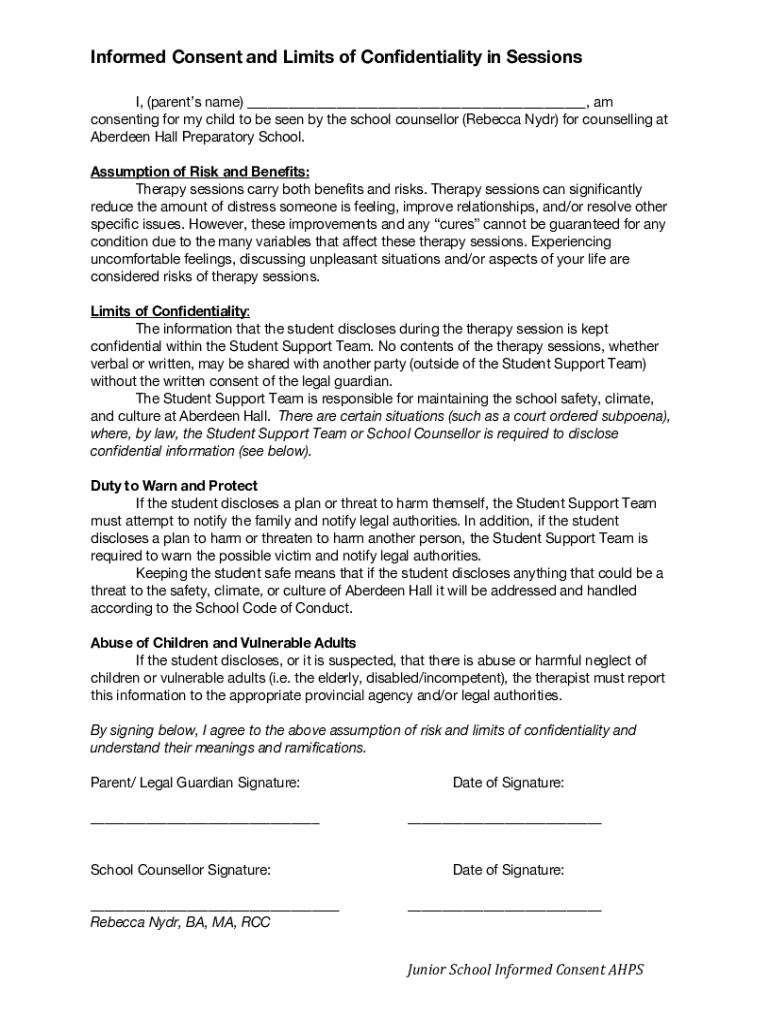Informed Consent and Limits of Confidentiality in Sessions I, (parents name), am I consenting for my child to be seen by the school counselor (Rebecca NDR) for counselling at Aberdeen Hall Preparatory