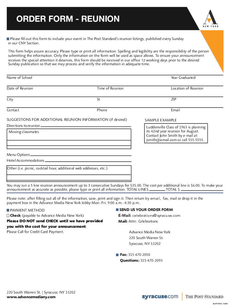 ORDER FORM REUNION Please fill out this form to include your event in The PostStandards reunion listings, published every Sunday in our CNY Section. This form helps assure accuracy. Please type or