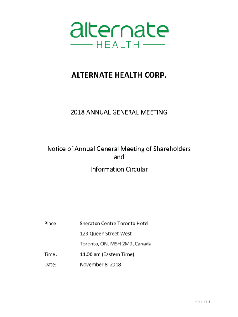 ALTERNATE HEALTH CORP.2018 ANNUAL GENERAL MEETINGNotice of Annual General Meeting of Shareholders and Information CircularPlace:Sheraton Center Toronto Hotel 123 Queen Street West Toronto, ON, M5H