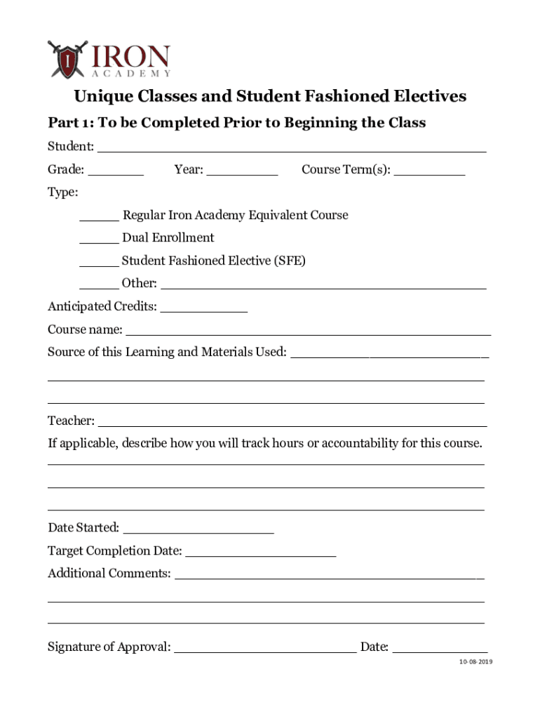 Unique Classes and Student Fashioned Electives Part 1: To be Completed Prior to Beginning the Class Student: Grade: Year: Course Term(s): Type: Regular Iron Academy Equivalent Course Dual Enrollment