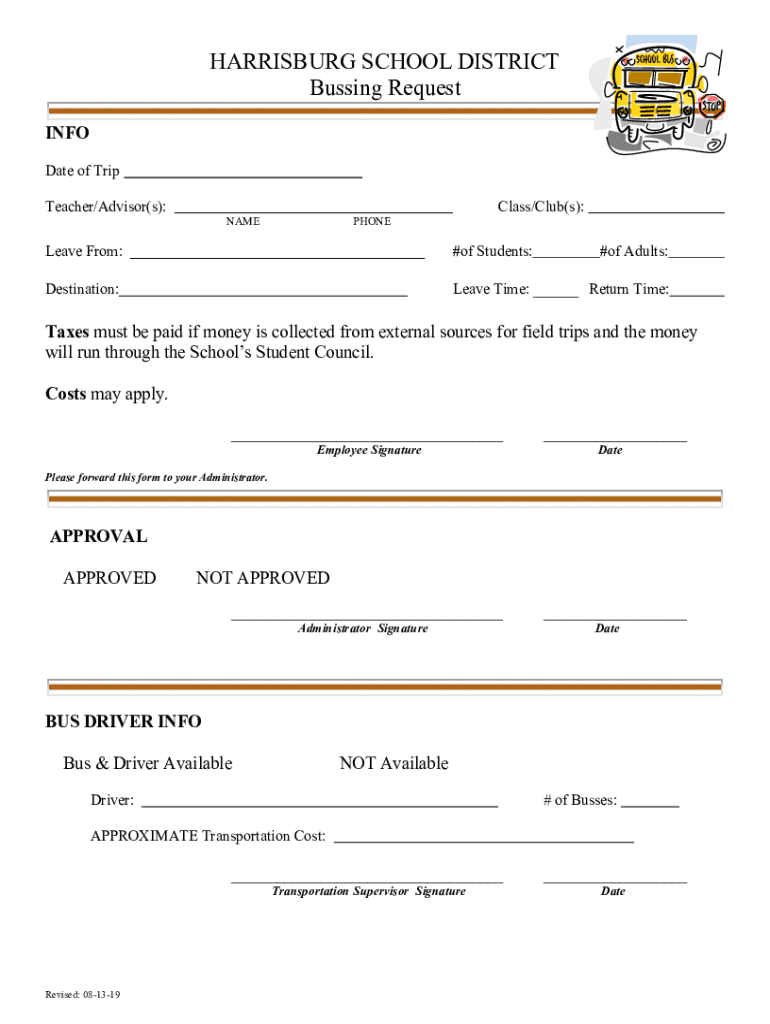HARRISBURG SCHOOL DISTRICT Bussing Request INFO Date of Trip Teacher/Advisor(s):Class/Club(s): NAMEPHONELeave From: #of Students:#of Adults:Destination:Leave Time: Return Time:Taxes must be paid if