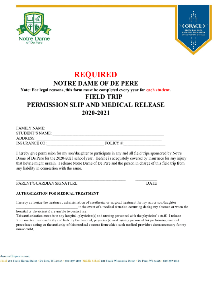 REQUIRED NOTE DAME OF DE Père Note: For legal reasons, this form must be completed every year for each student. FIELD TRIP PERMISSION SLIP AND MEDICAL RELEASE 20202021FAMILY NAME: STUDENTS NAME: