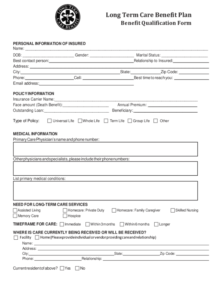 Long Term Care Benefit Plan Benefit Qualification Impersonal INFORMATION OF INSURED Name: DOB: Gender: Marital Status: Best contact person: Relationship to Insured: Address: City: State: Zip Code:
