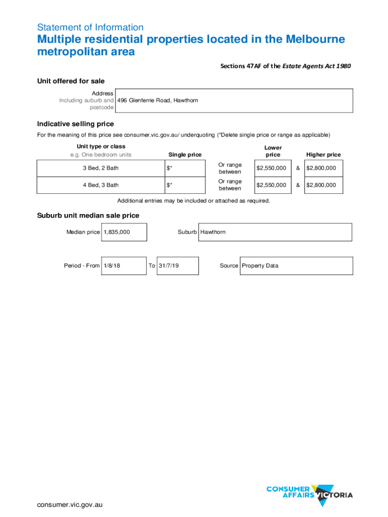 Statement of InformationMultiple residential properties located in the Melbourne metropolitan area Sections 47AF of the Estate Agents Act 1980 Unit offered for sale Address Including suburb and 496