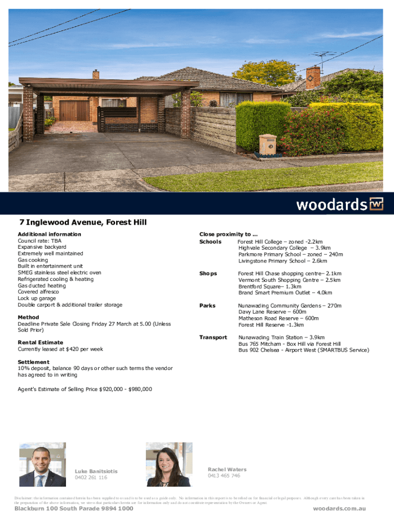 7 Inglewood Avenue, Forest Hill Additional information Council rate: TBA Expansive backyard Extremely well maintained Gas cooking Built in entertainment unit MEG stainless steel electric oven Refrigerated