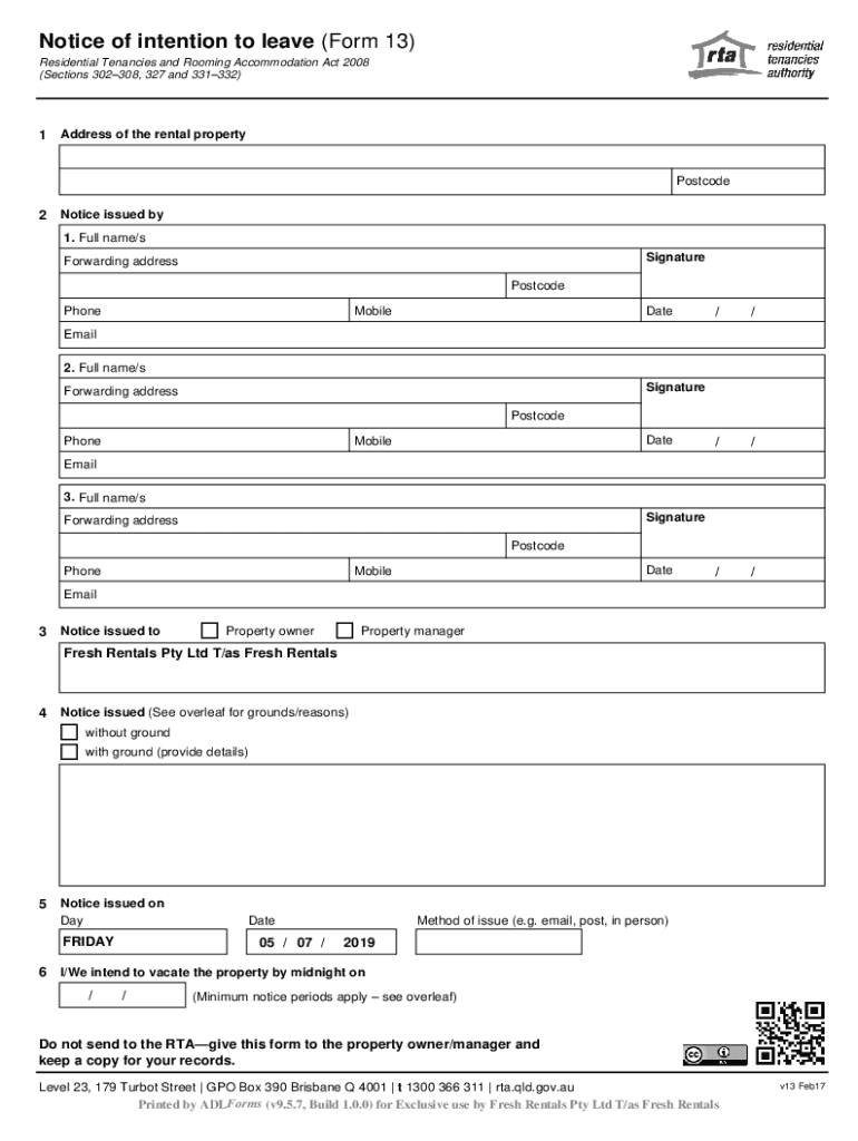 Get the free Notice of intention to leave (Form 13)Residential ...Notice of intention to leave (F...