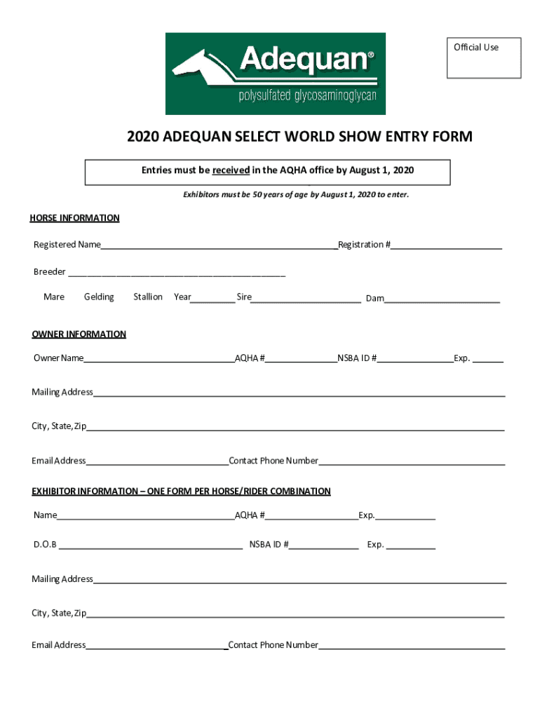 Official Use2020 SELECT WORLD SHOW ENTRY FORM Entries must be received in the AQUA office by August 1, 2020, Exhibitors must be 50 years of age by August 1, 2020, to enter. HORSE INFORMATION Registered