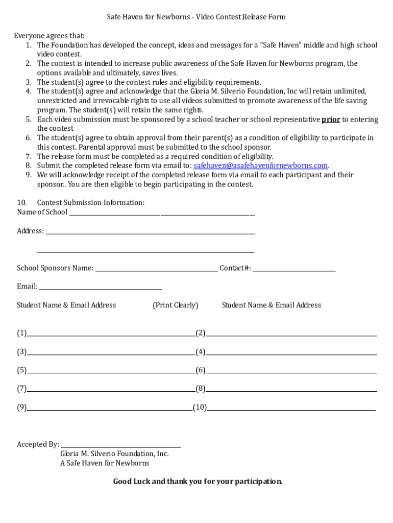 Safe Haven for Newborns Video Contest Release Form Everyone agrees that: 1. The Foundation has developed the concept, ideas and messages for a Safe Haven middle and high school video contest. 2. The