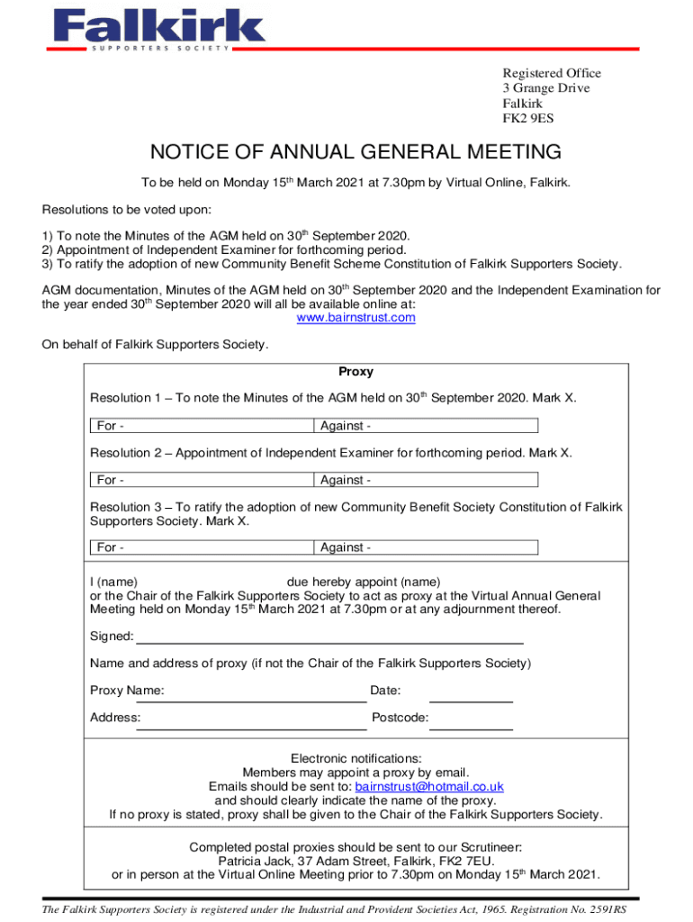 To be held on Monday 15th March 2021 at 7.30pm by Virtual Online, Selkirk.