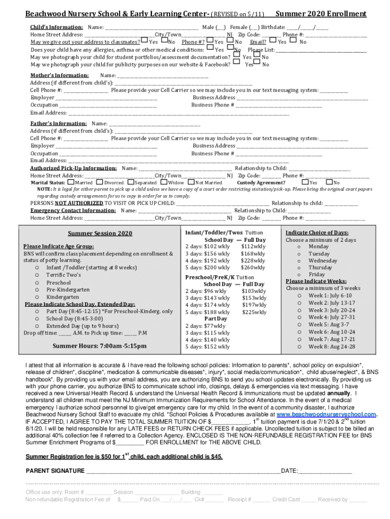 Beachwood Nursery School & Early Learning Center (REVISED on 5/11)Summer 2020 EnrollmentChilds Information: Name: Male () Female () Birthdate: / / Home Street Address: City/Town NJ Zip Code: Phone