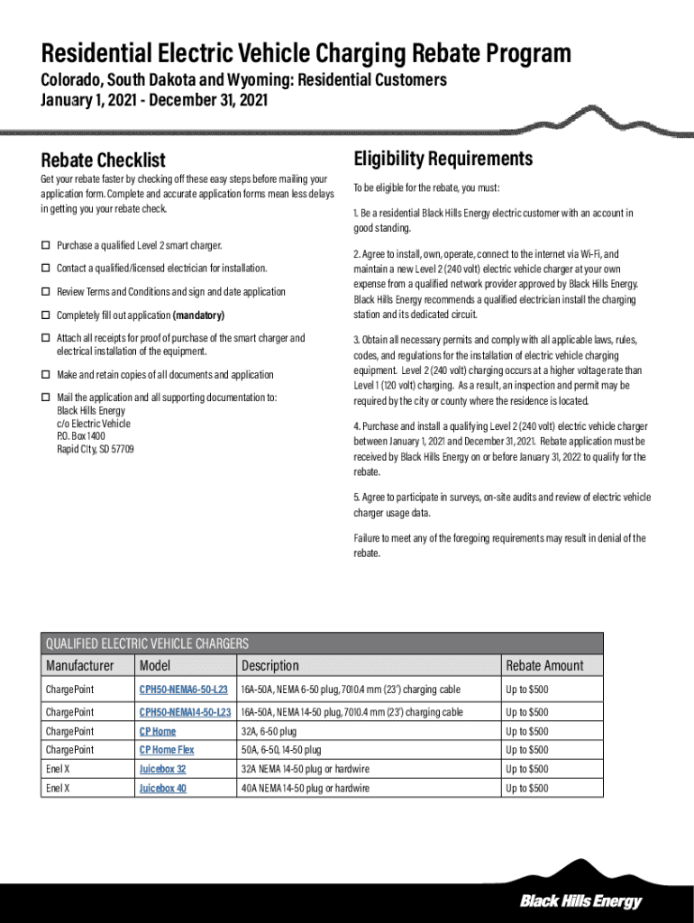 Residential Electric Vehicle Charging Rebate Program Colorado, South Dakota and Wyoming: Residential Customers January 1, 2021, December 31, 2021Rebate Checklist your rebate faster by checking off